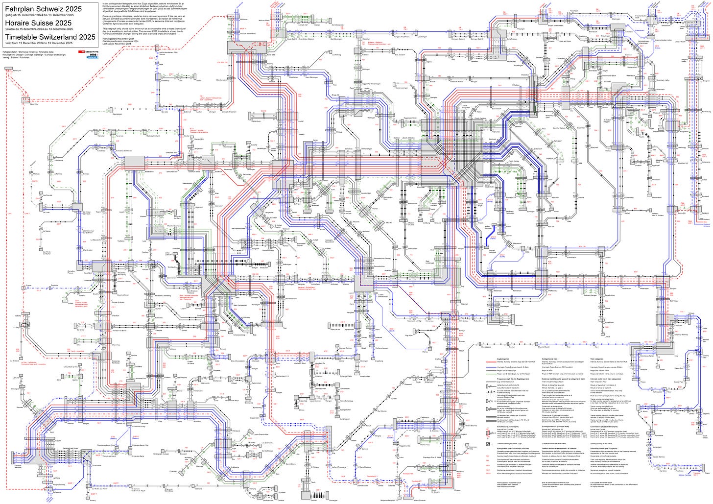At the same time, these companies are all integrated into a genuinely national network: Switzerland does have a ‘guiding mind’, while avoiding the pitfalls of overcentralisation. Around each city the fares of different operators are co-ordinated into a simple zonal system, and the Swiss timetable is designed so that trains connect with one another, even when they are run by different operators. You can see the whole of the Swiss timetable on one diagram: